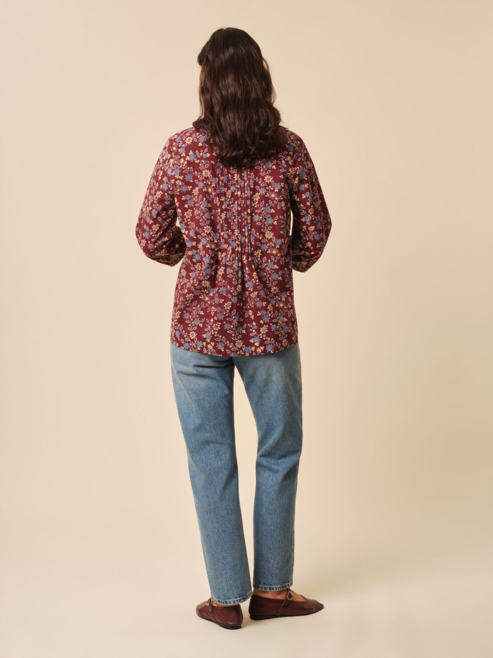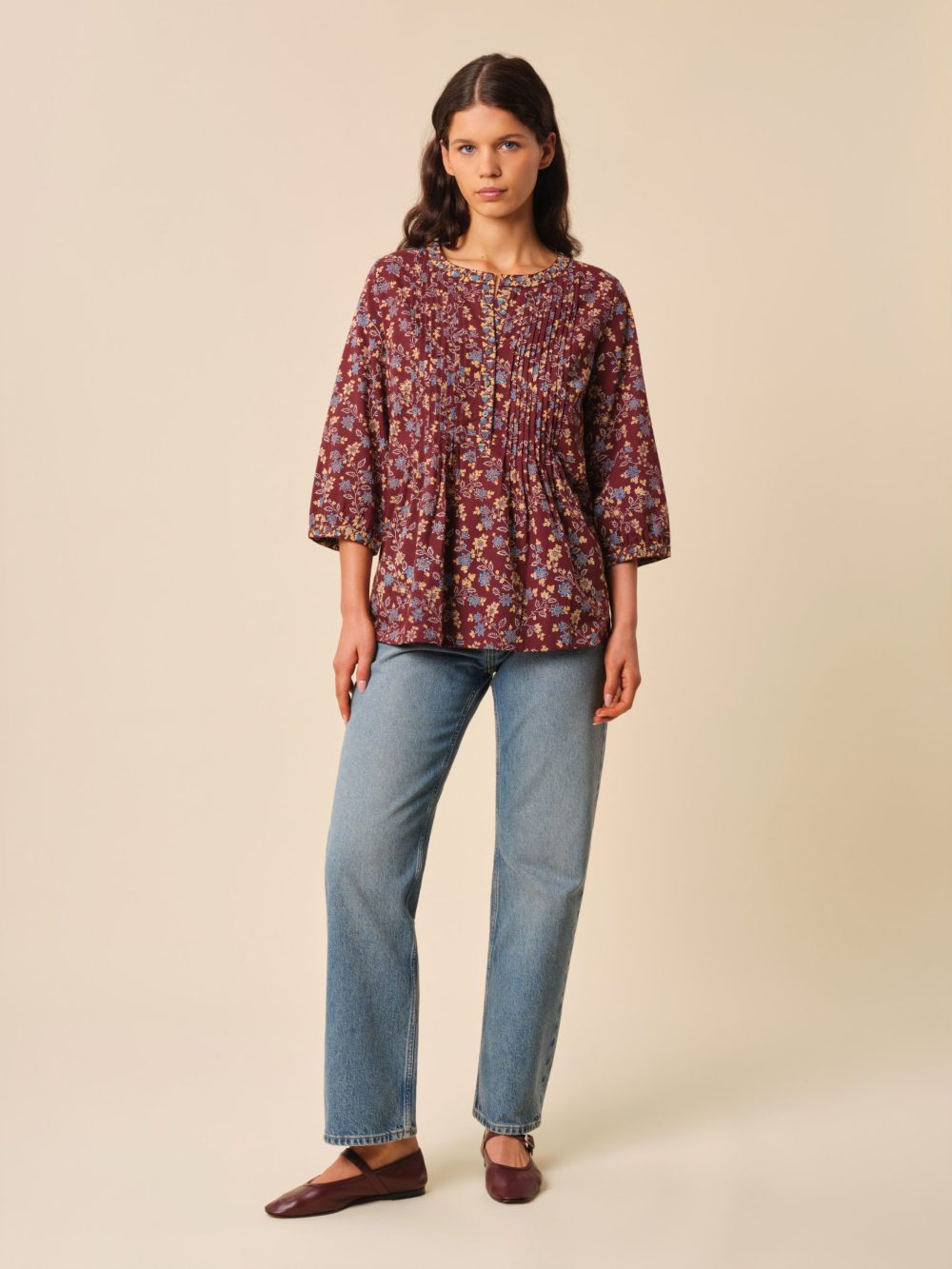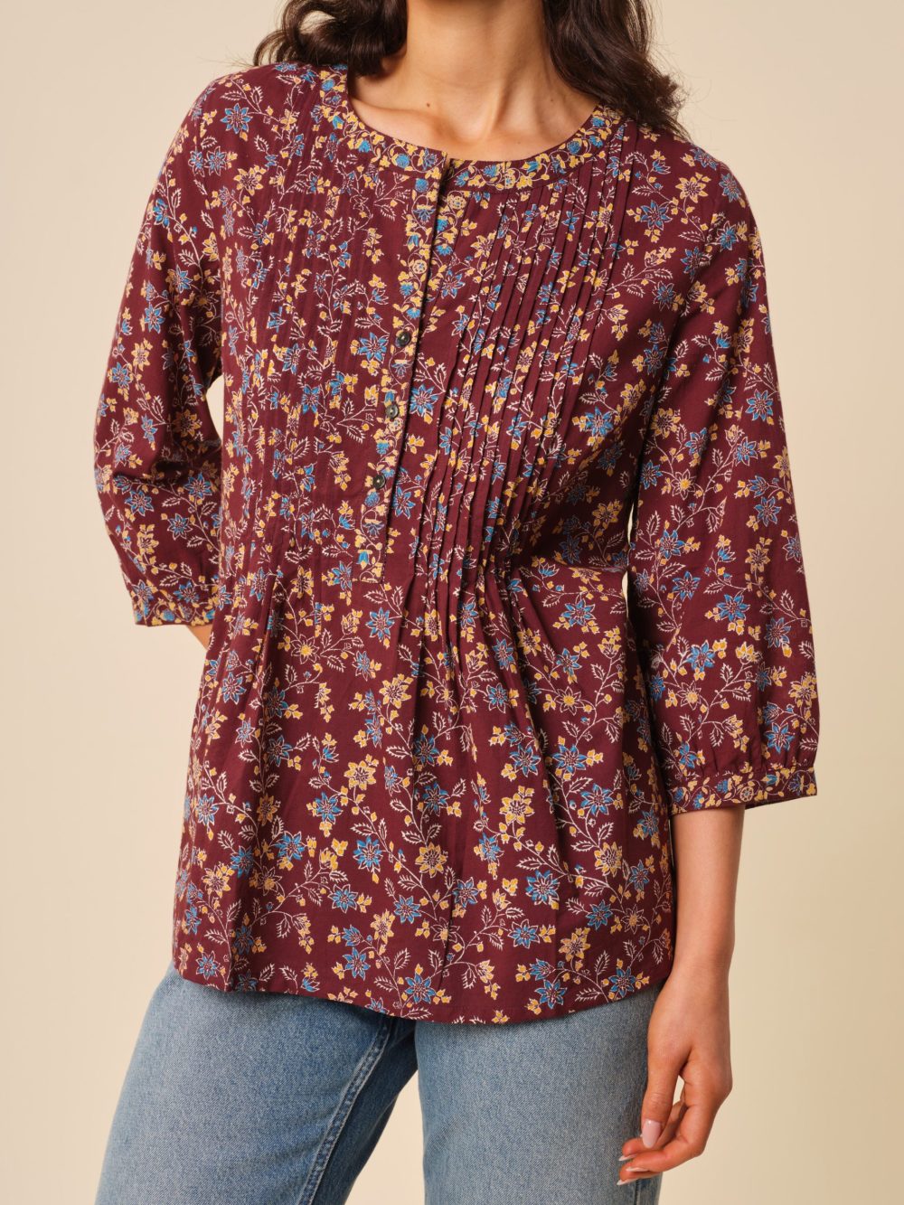Confectionnée à partir d’un voile de coton imprimé à la main, notre blouse Agra regorge de détails délicats.