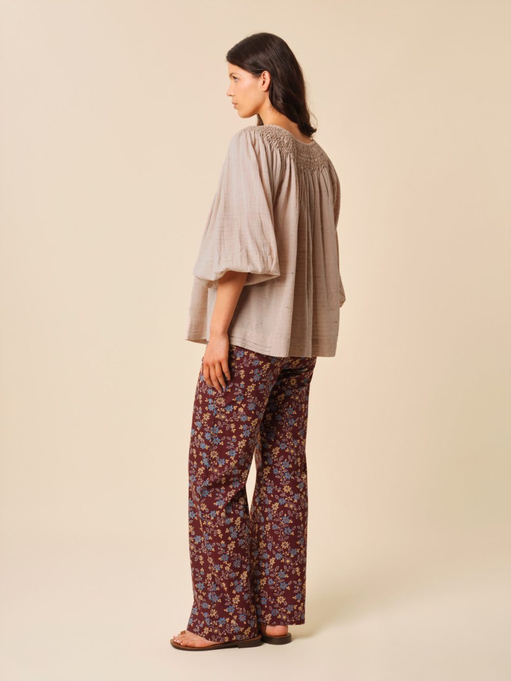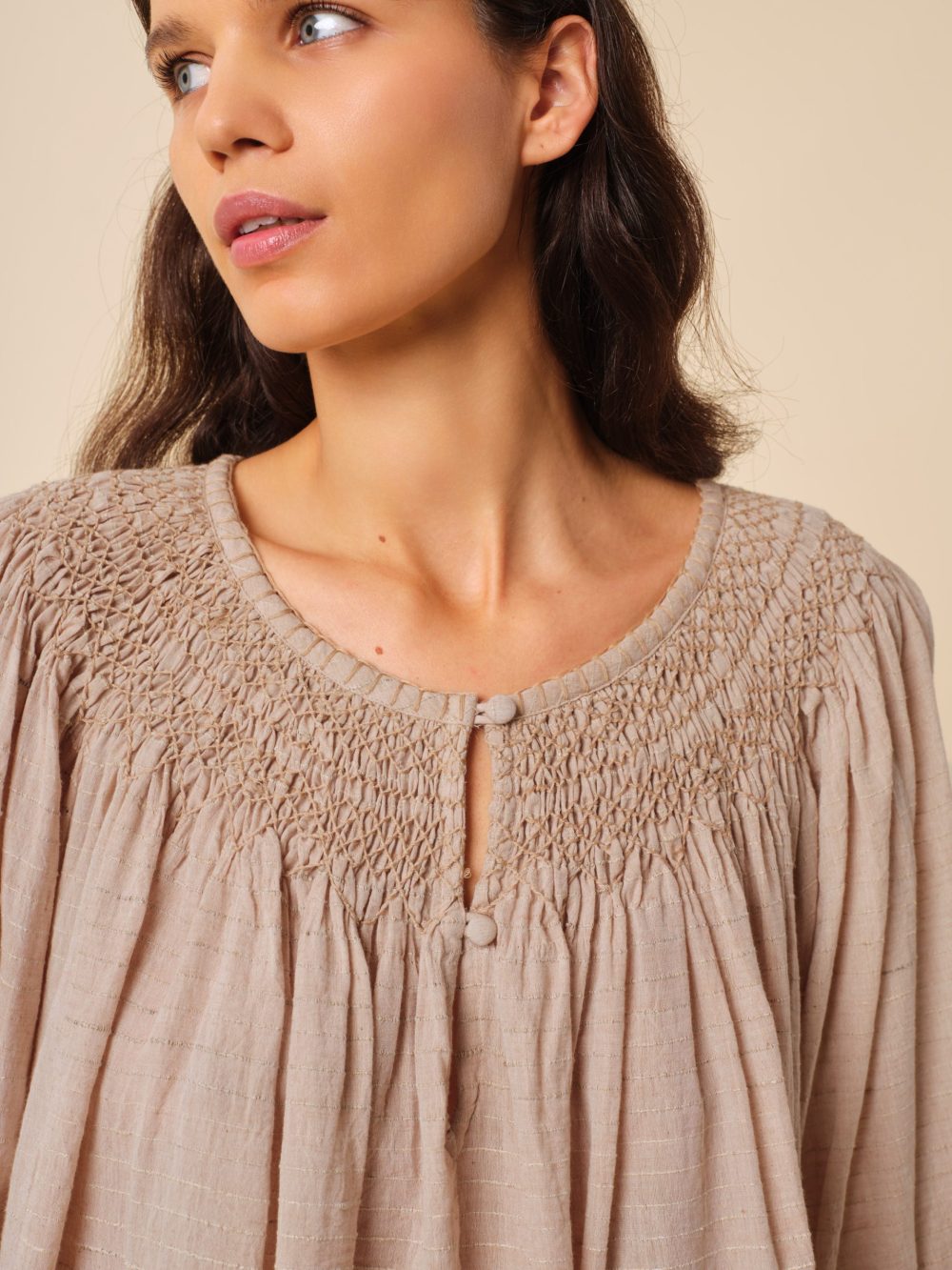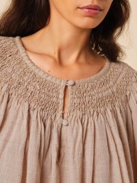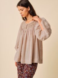 Son col orné d’une broderie smockée apporte une touche délicate et sophistiquée, tandis que ses manches légèrement bouffantes et sa coupe ample invitent à une silhouette décontractée et fluide. Légère et agréable à porter, la blouse Anouschka est la pièce idéale pour un look chic et naturel.