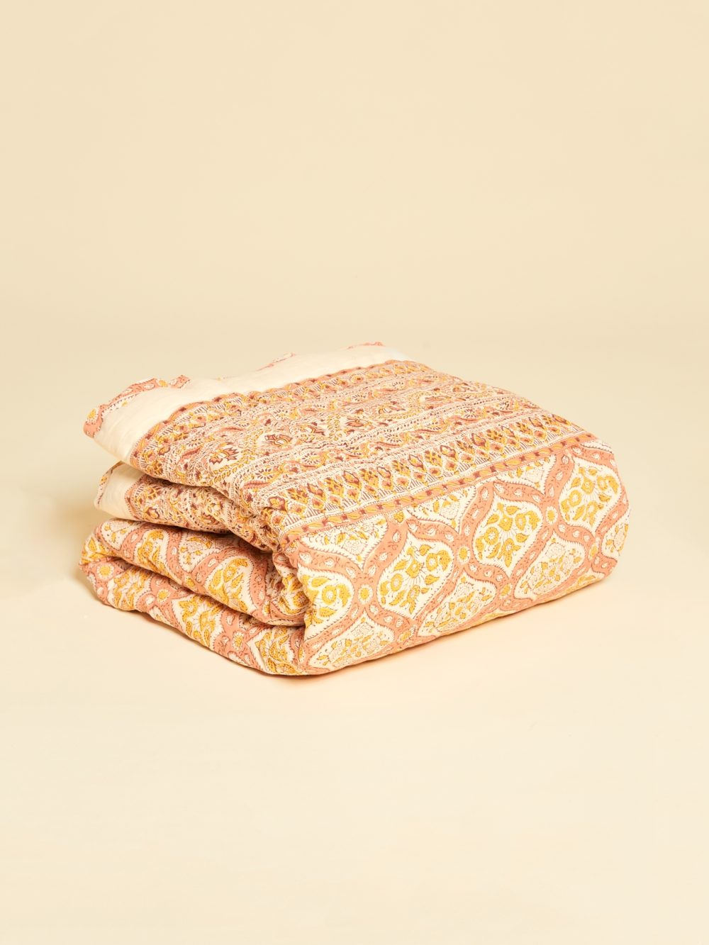 Réversible, il arbore deux motifs uniques imprimés à la main. Il est entièrement confectionné en coton : son tissu extérieur en voile de coton léger se marie parfaitement avec le rembourrage en ouate de coton pour une texture matelassée des plus agréables. Adapté à toutes les saisons, il conserve sa fraîcheur en été et vous réchauffe en hiver. Il peut servir de courtepointe, de plaid pour votre canapé ou même de tapis de jeux pour enfant.