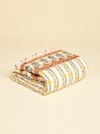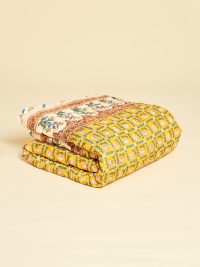 Réversible, il arbore deux motifs uniques imprimés à la main. Il est entièrement confectionné en coton : son tissu extérieur en voile de coton léger se marie parfaitement avec le rembourrage en ouate de coton pour une texture matelassée des plus agréables. Adapté à toutes les saisons, il conserve sa fraîcheur en été et vous réchauffe en hiver. Il peut servir de courtepointe, de plaid pour votre canapé ou même de tapis de jeux pour enfant.