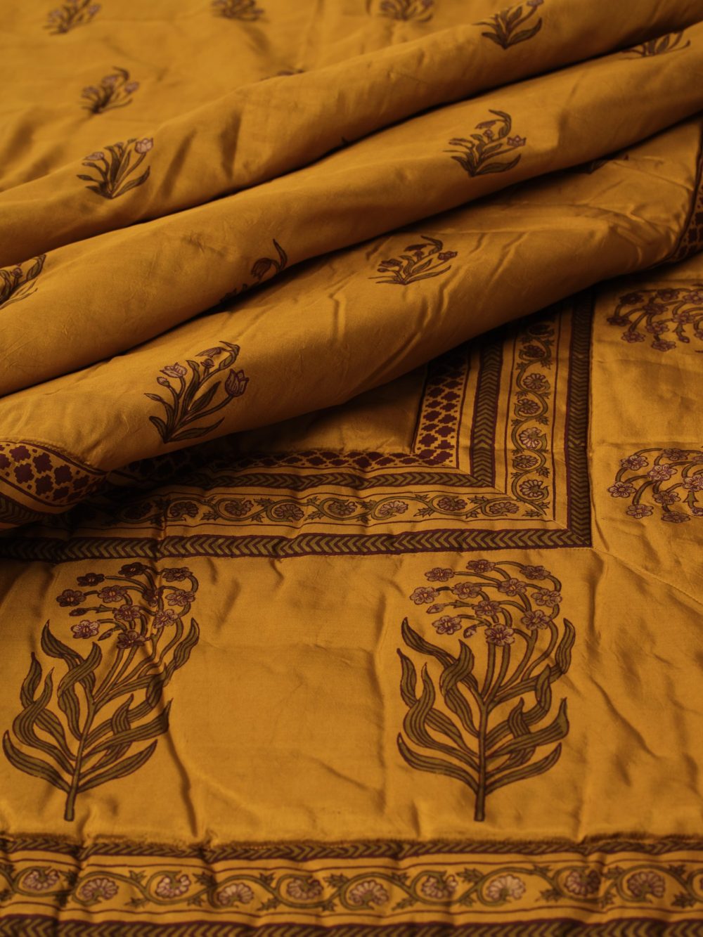 La soie, teintée or, est travaillée par un procédé de décharge révélant les motifs clairs, puis soulignée d’un contour noir. Un pigment doré, appliqué à la main avec une extrême précision, illumine certains détails sans jamais en altérer la finesse, créant un relief délicat presque brodé.
