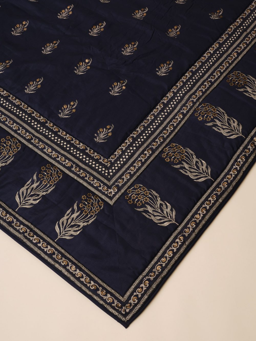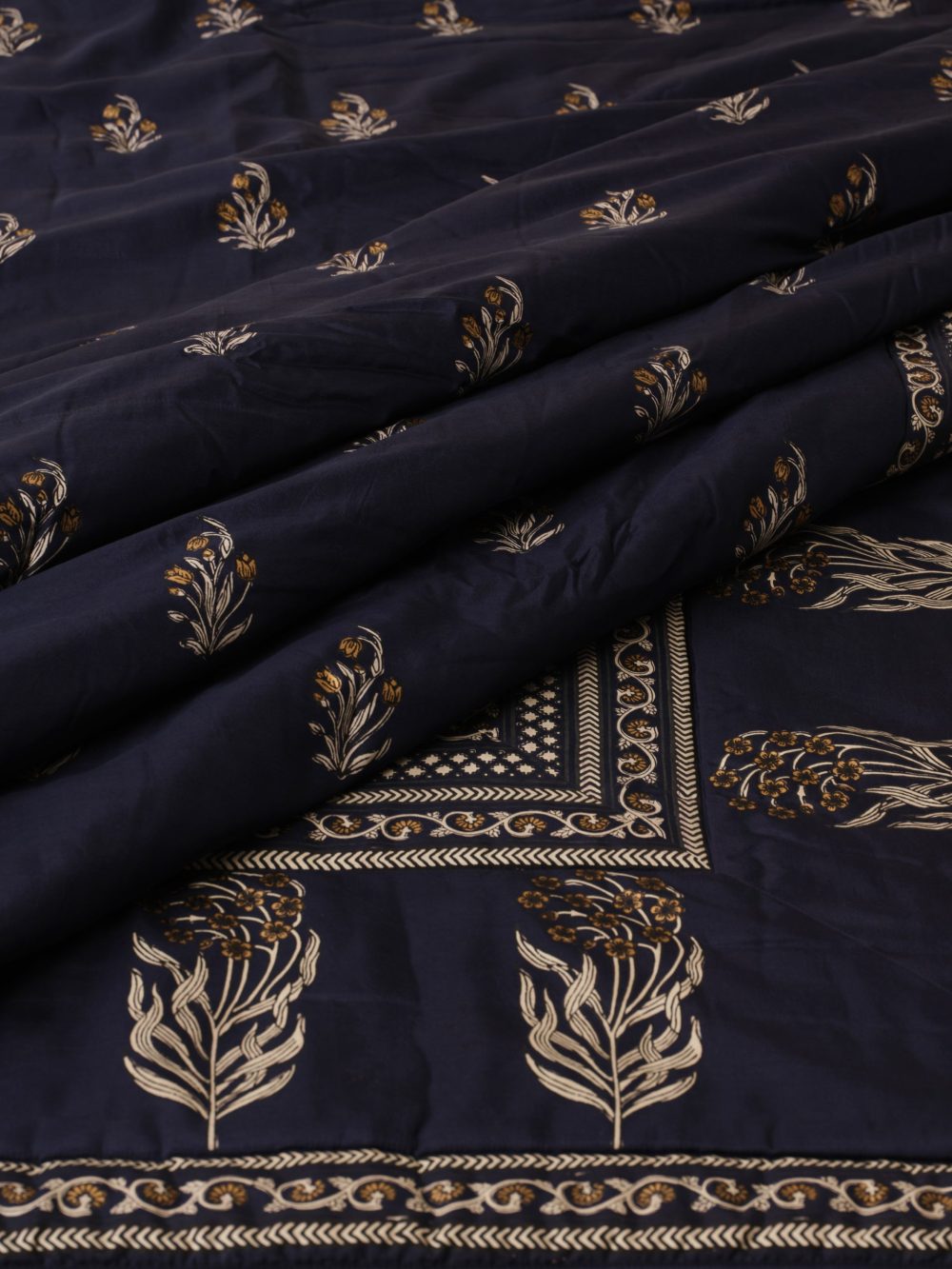 La légèreté de la soie exige un geste sûr : chaque motif est posé et parfaitement aligné, sans reprise possible. Cette maîtrise donne naissance à un champ floral aérien, inspiré des jardins moghols, où le buta, symbole d’arbre de vie, semble flotter et vibrer dans l’espace.