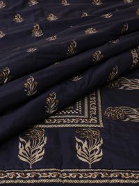 La soie, teinte dans un profond ton bleu, est travaillée par un procédé de décharge révélant les motifs clairs, puis soulignée d’un contour noir. Un pigment doré, appliqué à la main avec une extrême précision, illumine certains détails sans jamais en altérer la finesse, créant un relief délicat presque brodé.