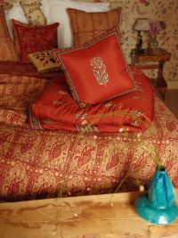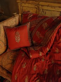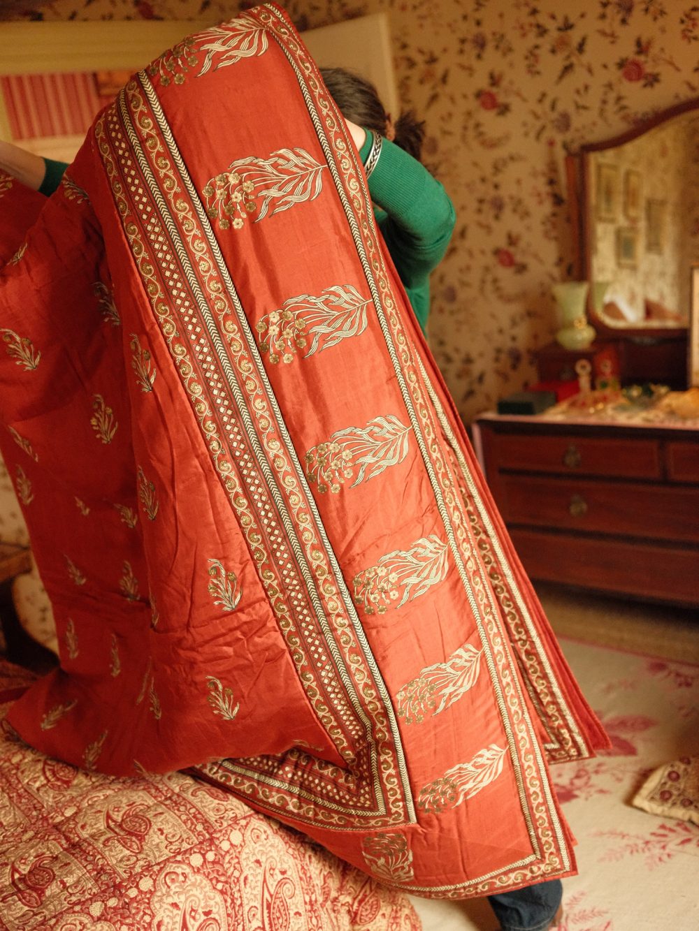 La légèreté de la soie exige un geste sûr : chaque motif est posé et parfaitement aligné, sans reprise possible. Cette maîtrise donne naissance à un champ floral aérien, inspiré des jardins moghols, où le buta, symbole d’arbre de vie, semble flotter et vibrer dans l’espace.