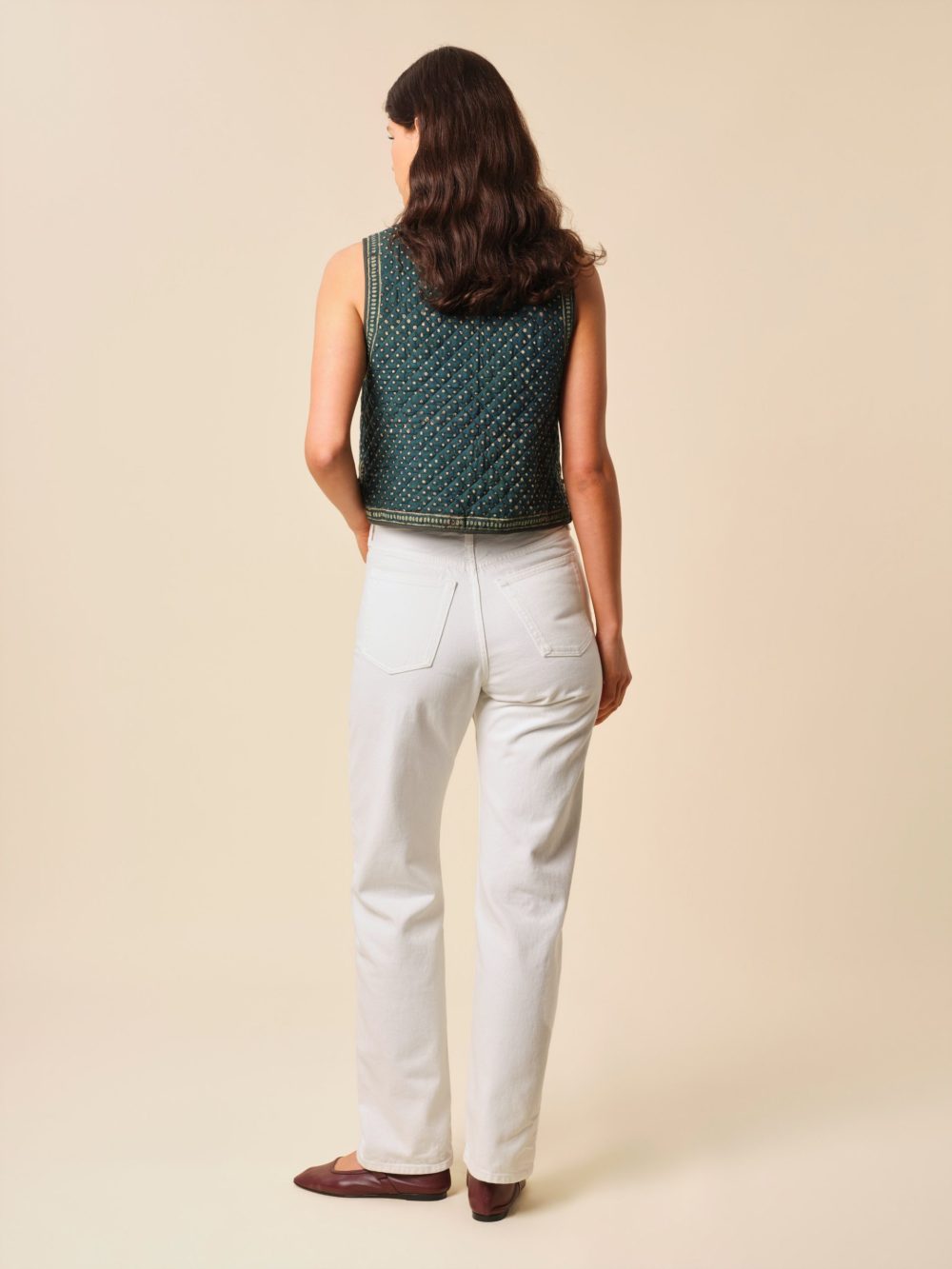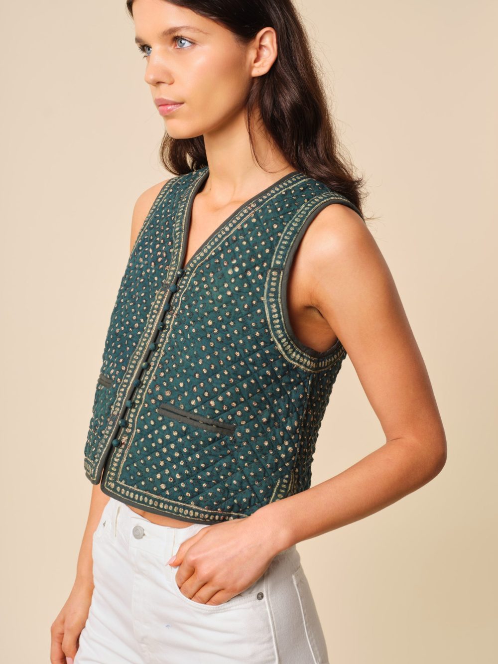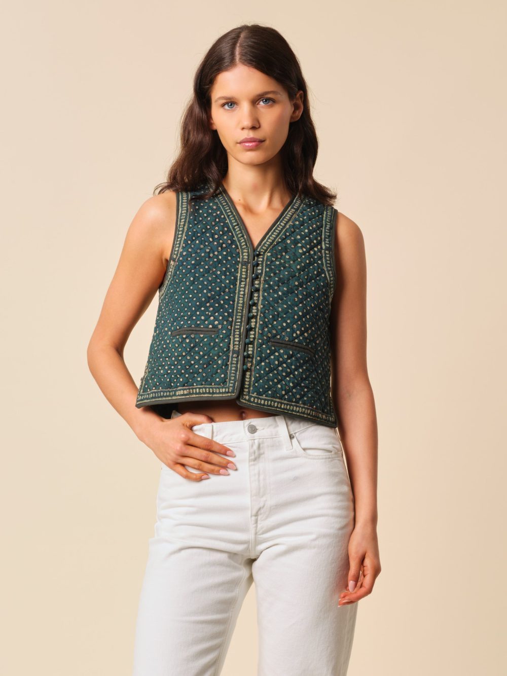 Notre gilet Amir est une relecture de la bohème chic des années 70 inspiré d'un veston d'homme matelassé.