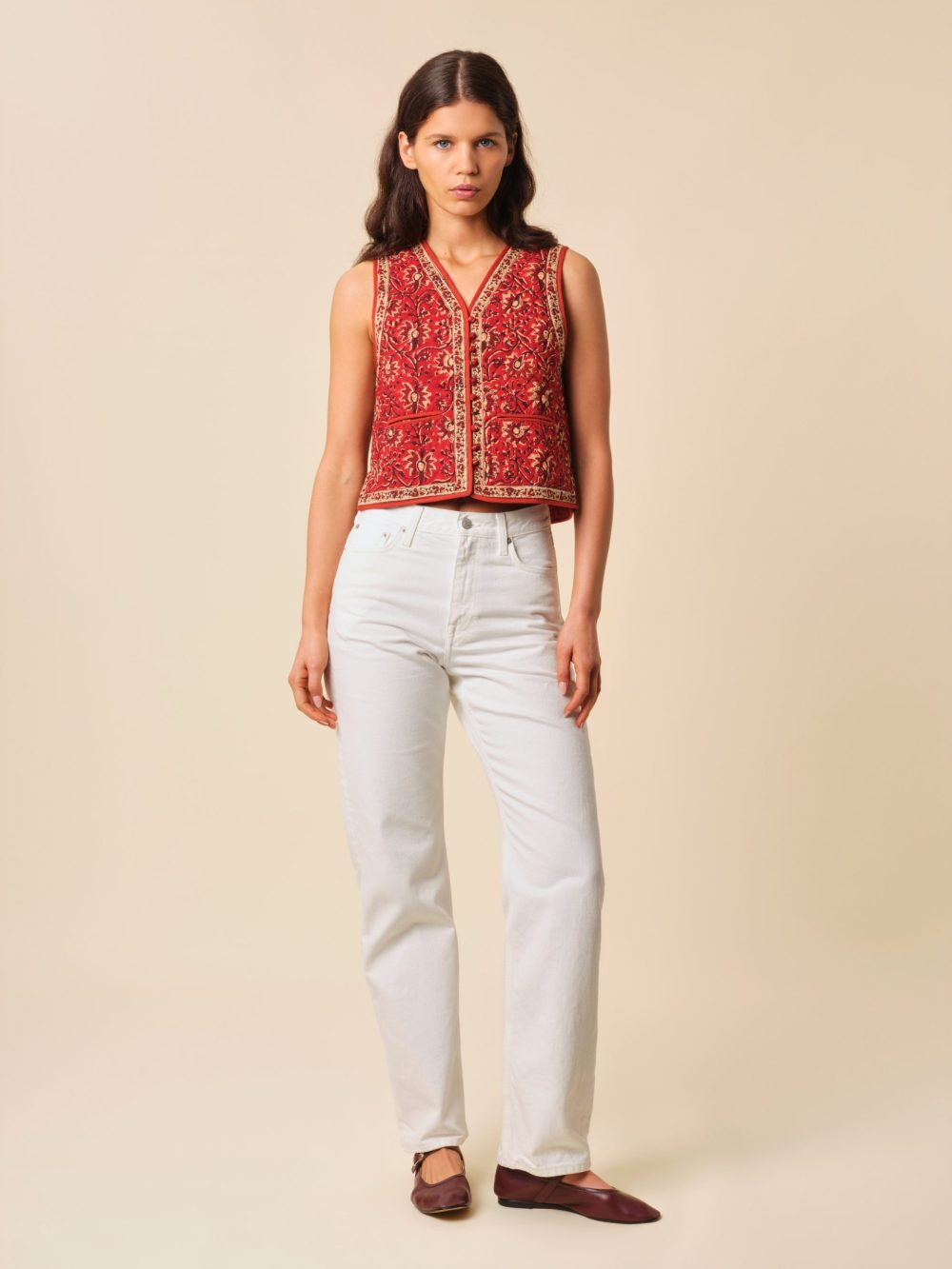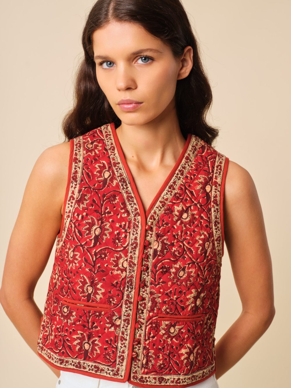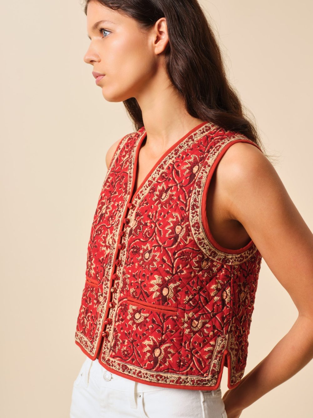 Notre gilet Amir est une relecture de la bohème chic des années 70 inspiré d'un veston d'homme matelassé.