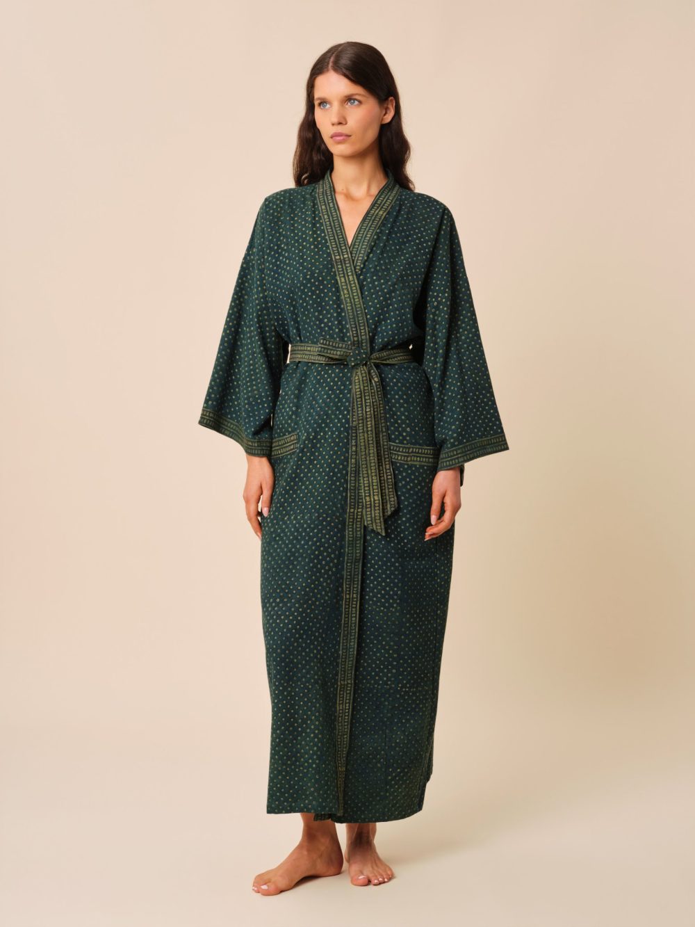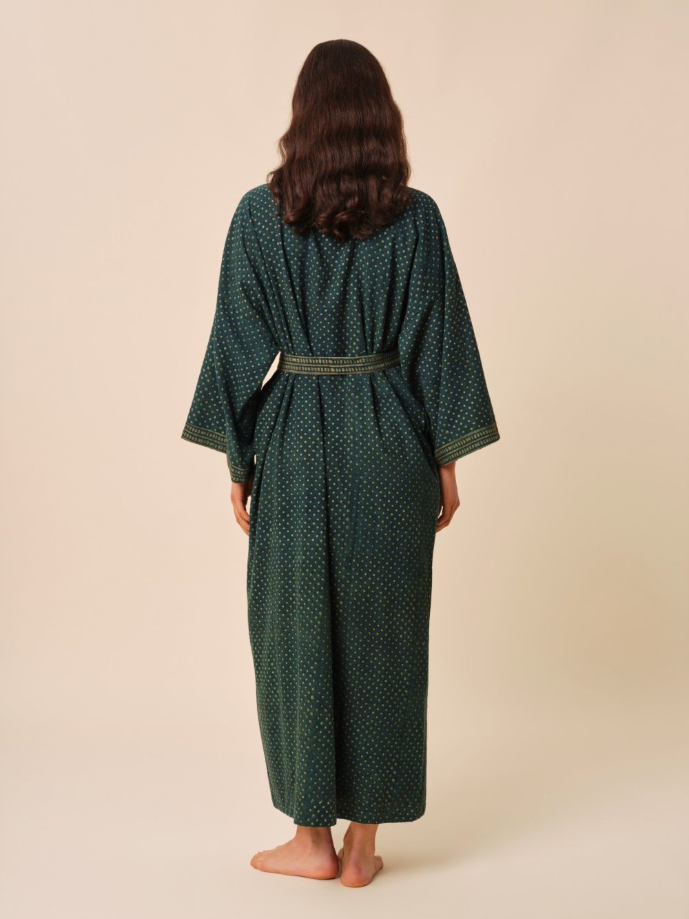 Réalisé en twill de coton et entièrement imprimé à la main, il dispose d’une ceinture amovible qui vous permettra de le maintenir bien fermé tout en définissant votre silhouette.