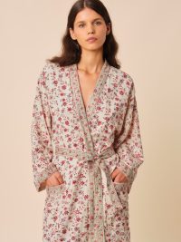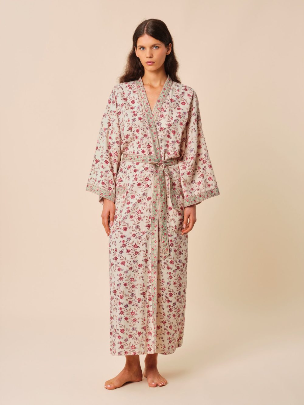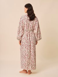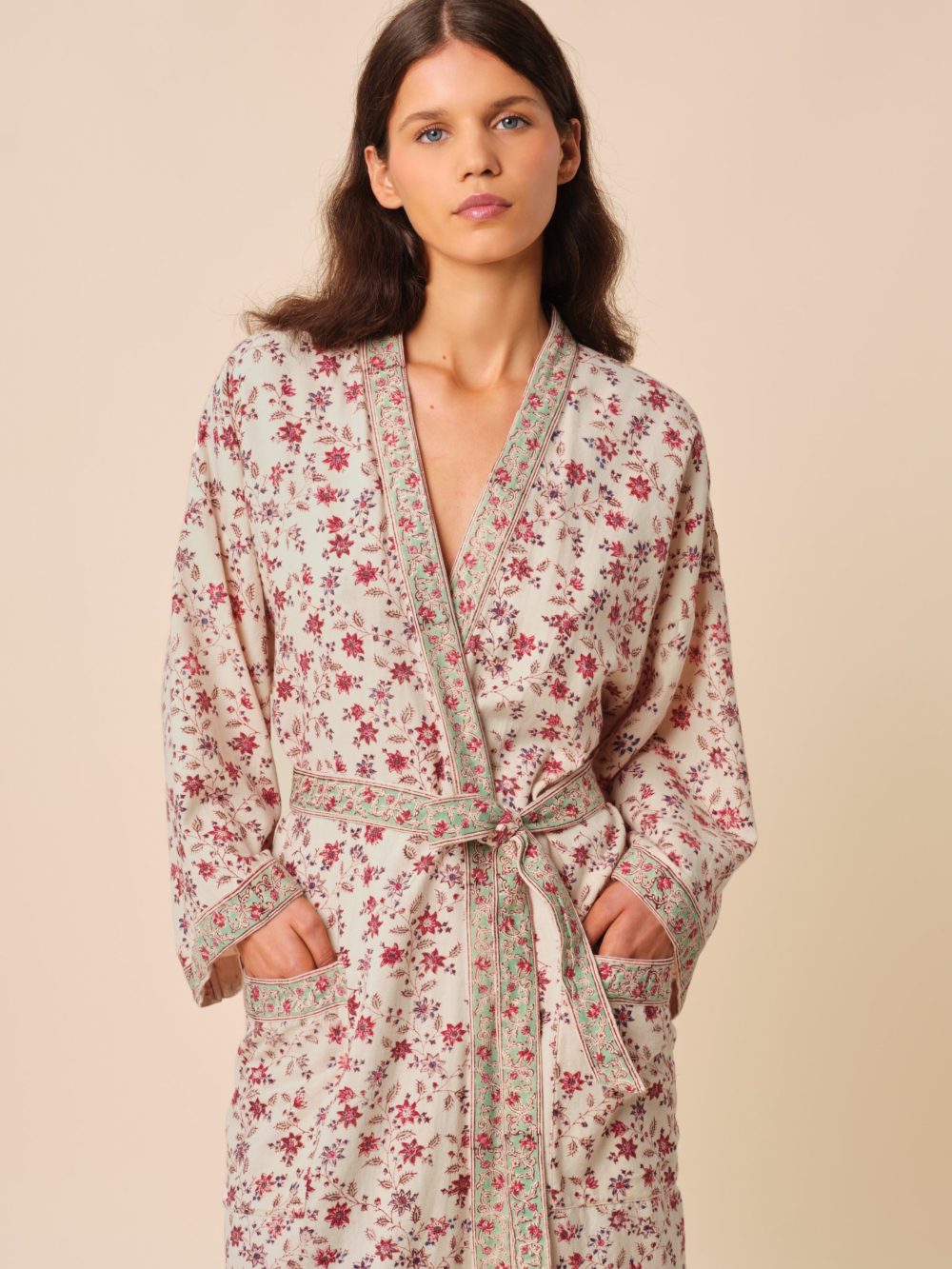Réalisé en twill de coton et entièrement imprimé à la main, il dispose d’une ceinture amovible qui vous permettra de le maintenir bien fermé tout en définissant votre silhouette.