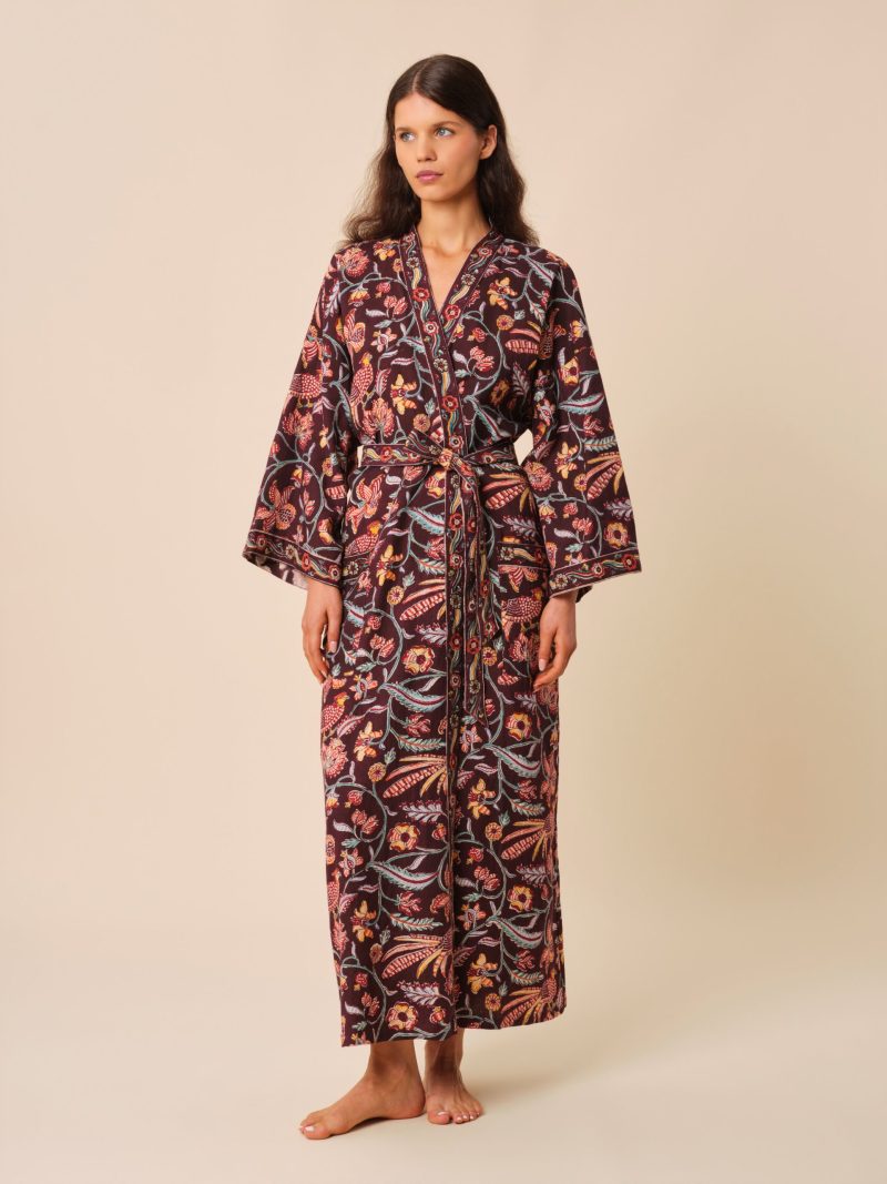 Notre kimono iconique peut être porté de différentes façons : comme un peignoir à la maison, sur une robe comme une veste longue ou encore par-dessus un bikini comme une sortie de bain pour rentrer de la plage.
