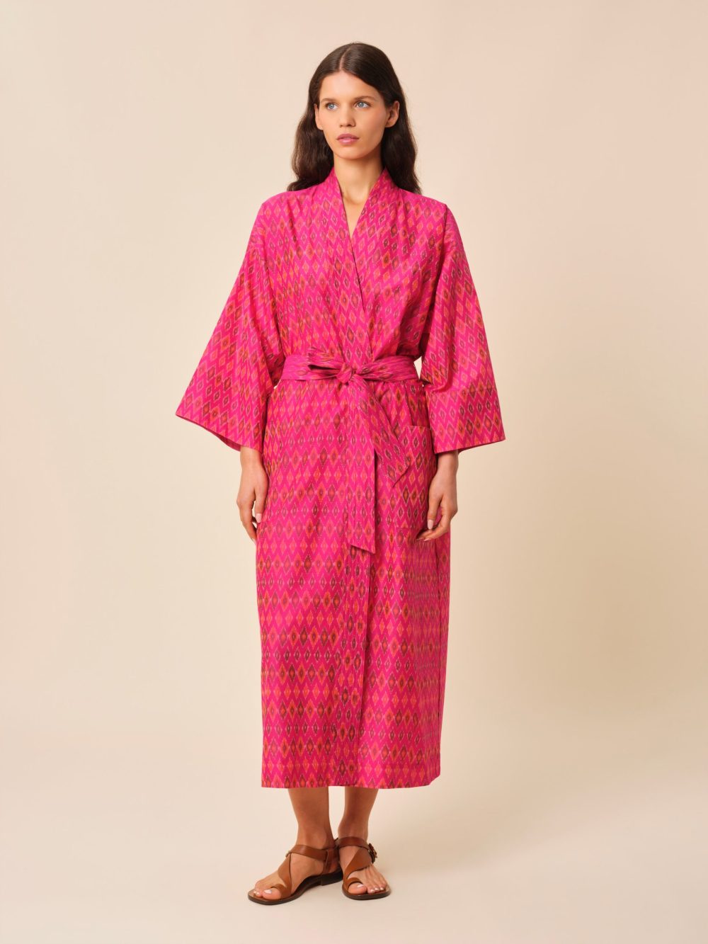 Notre kimono iconique peut être porté de différentes façons : comme un peignoir à la maison, sur une robe comme une veste longue ou encore par-dessus un bikini comme une sortie de bain pour rentrer de la plage.