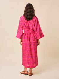 Réalisé en soie et coton et entièrement tissé à la main avec la technique de l'Ikat, il dispose d’une ceinture amovible qui vous permettra de le maintenir bien fermé tout en définissant votre silhouette.
