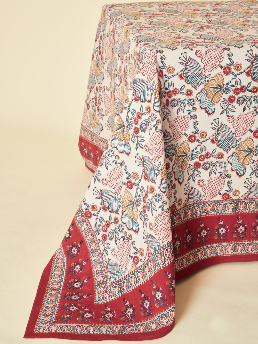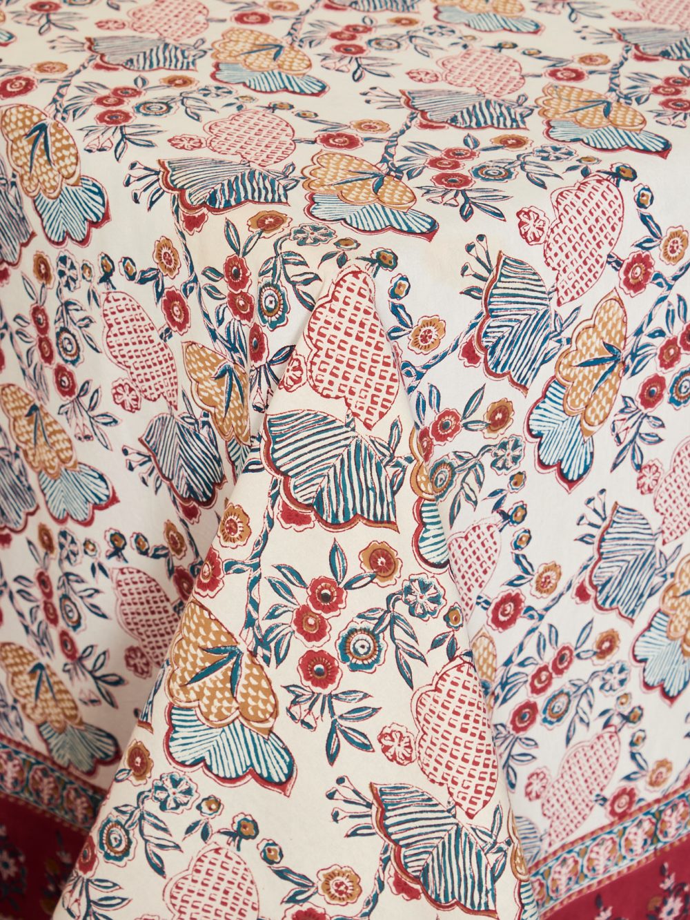Notre nappe en coton est l'accessoire parfait pour apporter une touche d'originalité à votre intérieur. La technique d'impression manuelle au bloc de bois fait que chaque nappe est un travail d'art en soi. Chaque pièce est unique, avec ses propres variations de couleurs et de motifs, ce qui en fait un véritable objet de décoration.