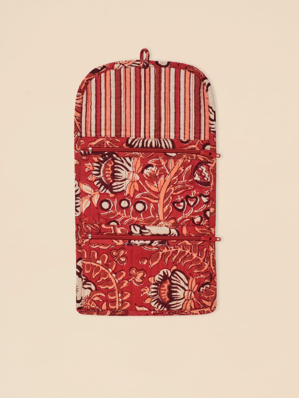 Il se déplie pour révéler deux poches zippées destinées à accueillir votre monnaie, vos bijoux, ou encore votre nécessaire de couture.