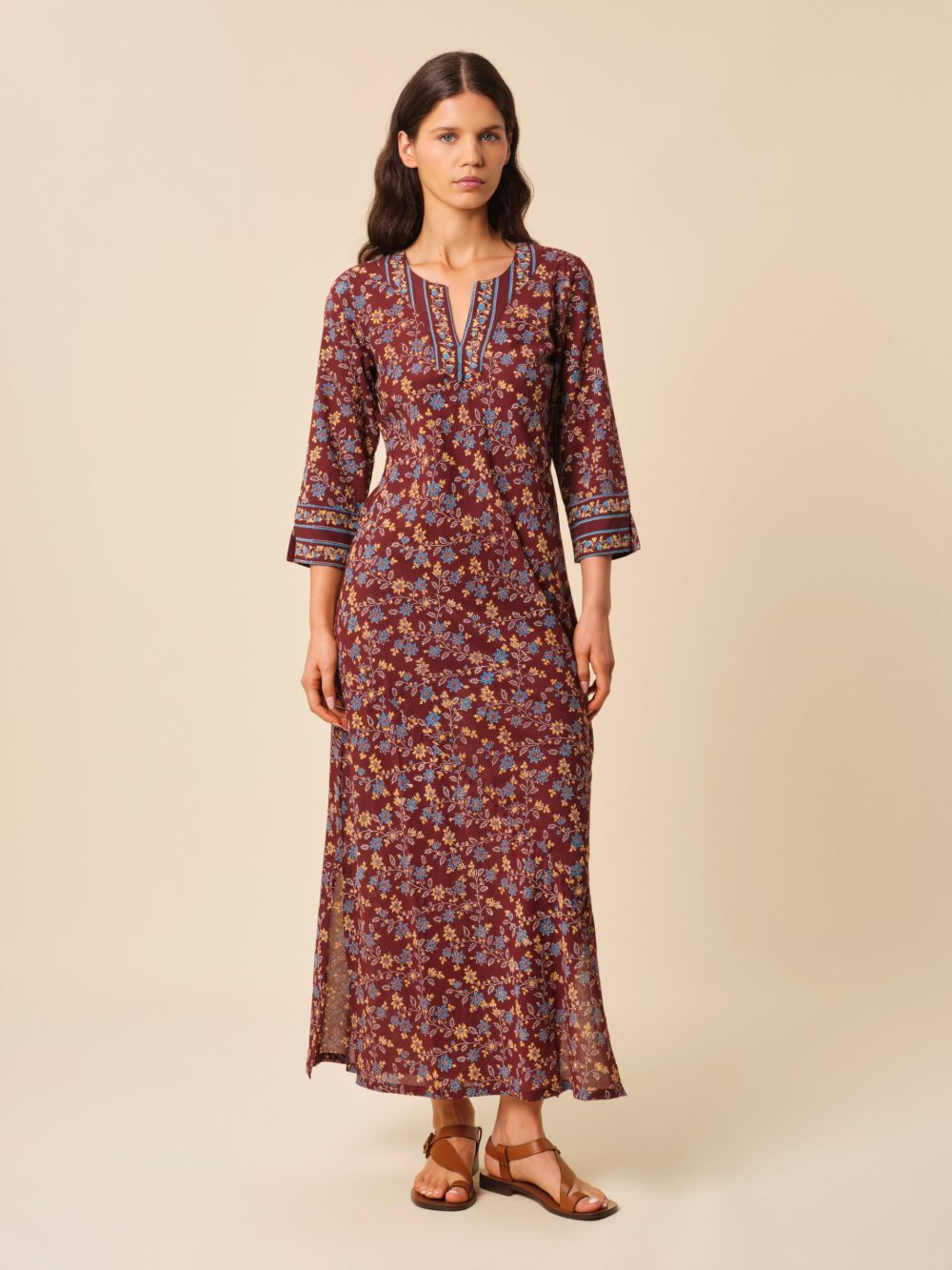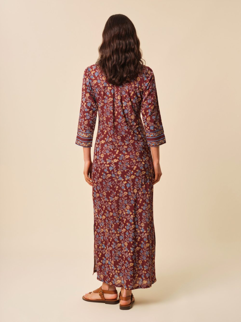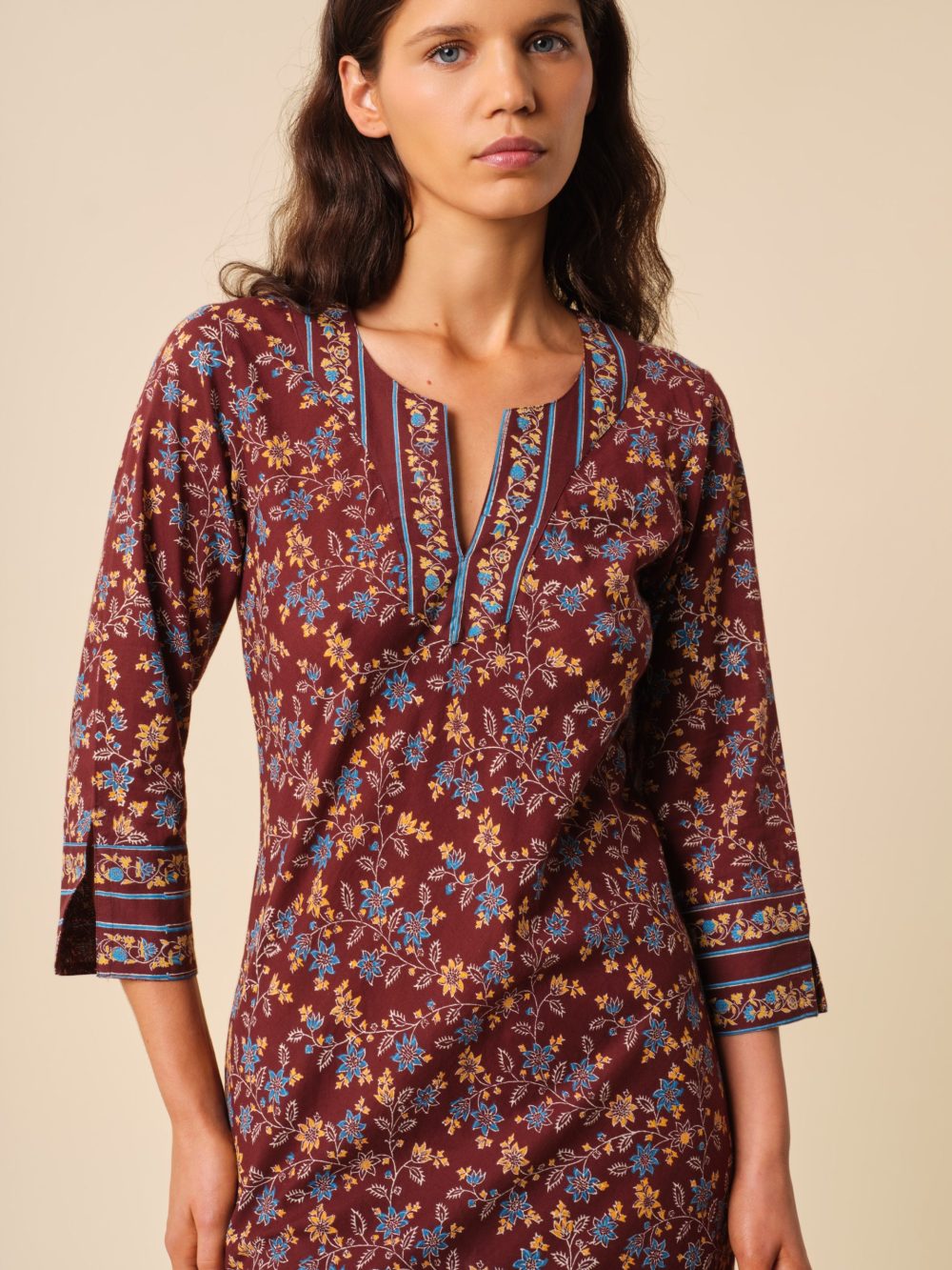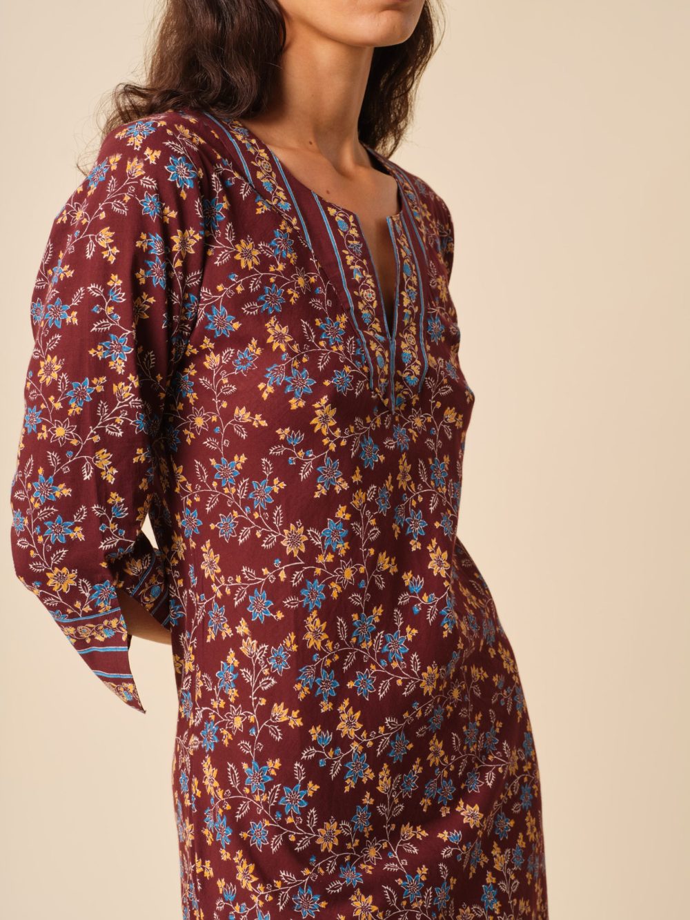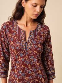 Notre robe kurta est réalisée en voile de coton léger et est soigneusement imprimée à la main afin d’obtenir un motif des plus délicats qui sera totalement unique.