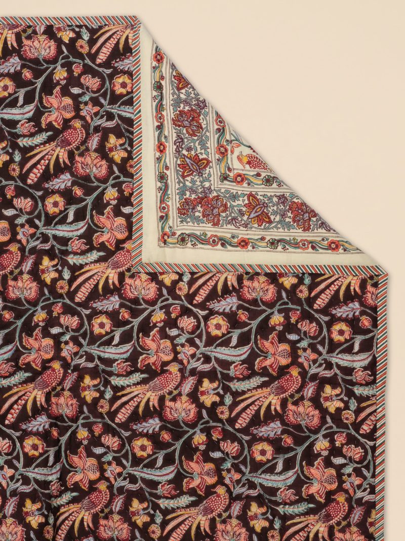 Reversible, both sides are hand printed with unique and delicate patterns. Available in three sizes, our bedspread fits perfectly on all types of beds, from single to king size.