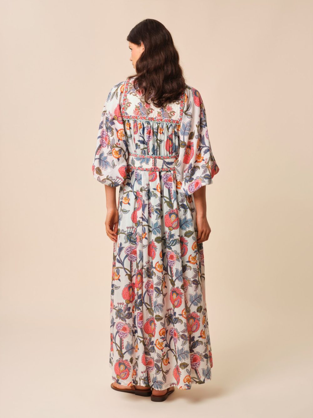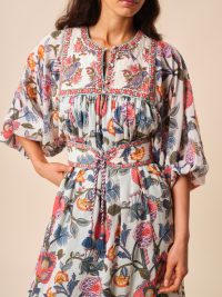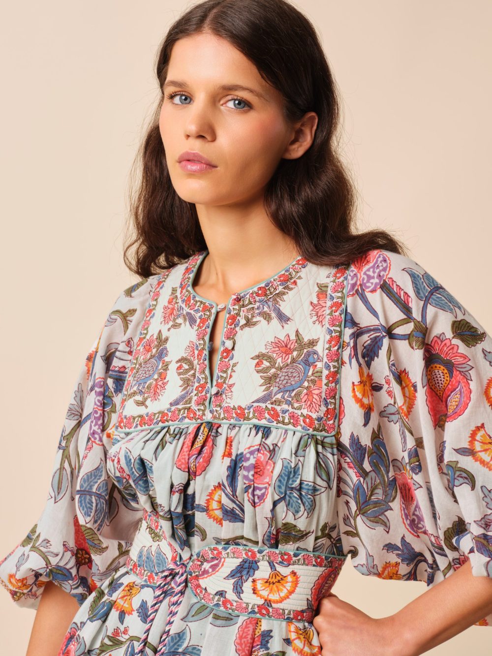 Its silhouette is enhanced by a quilted belt, delicately emphasising the waist while adding a structured touch. Its puffed sleeves and quilted bib neckline, embellished with tie fastenings, add a refined, feminine touch.