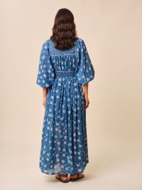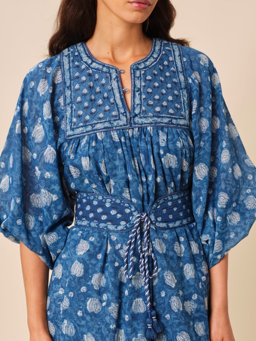 Its silhouette is enhanced by a quilted belt, delicately emphasising the waist while adding a structured touch. Its puffed sleeves and quilted bib neckline, embellished with tie fastenings, add a refined, feminine touch.